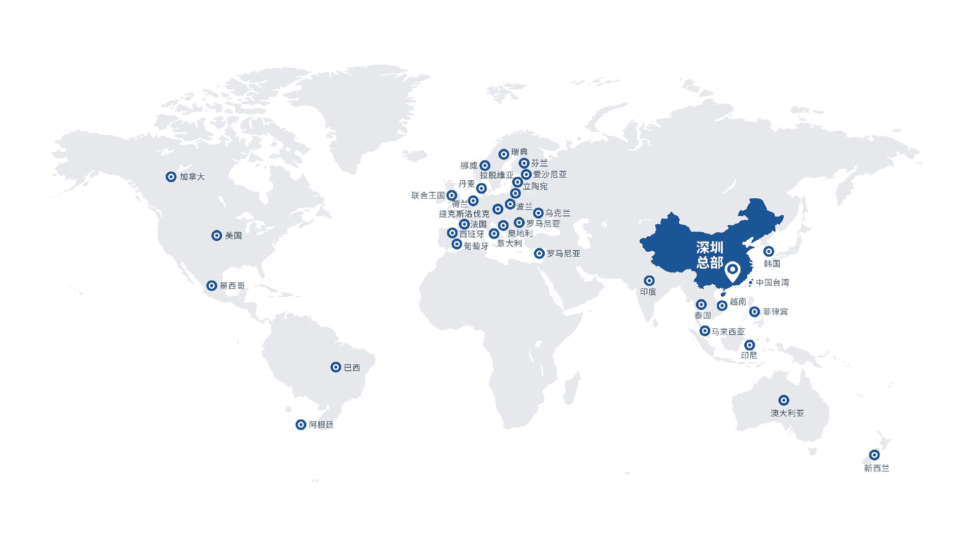 立足于國內(nèi)深圳、張家港、常州、天津、長沙、蘇州、濟南生產(chǎn)基地與備品備件庫,國內(nèi)外轄180+辦事處,在100多個國家和地區(qū)設(shè)立銷售服務機構(gòu),為全球用戶提供高品質(zhì)的產(chǎn)品與優(yōu)質(zhì)高效的服務。
